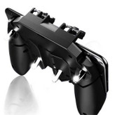 دسته AK66 مناسب برای انواع بازی های لمسی با قابلیت معرفی کلید مانند :PUBG ، FORTNITE ، Call of Duty و... است. دسته AK66 دارای 4 عدد پدال است. می توانید با تنظیم جای Aim و Shoot، شلیک و نشانه گیری را با این دسته کنترل کنید و علاوه بر این دو فرمان، 2 فرمان دیگر(مانند پرش و…) را هم با این دسته کنترل کنید. این یعنی کنترل هم زمان 6 فرمان بازی با 6 انگشت. این دسته، در مدت زمان خیلی کوتاه، سرعت کنترل شما در بازی را چند برابر می کند و شما را به سطح دلخواه در بازی می رساند. تسلط همزمان روی 6 فرمان، نکته ی متمایز کننده ی شما میان پلیر های دیگر میشود. تمام بخش هایی که با گوشی شما در تماس مستقیم است دارای پد های محافظت کننده جهت جلوگیری از وارد شدن آسیب و خط و خش احتمالی می باشد. همچنین مواد اولیه به کار رفته در ساخت ماشه ها و دسته بسیار با کیفت هستند. دسته ak66 فشاری به گوشی وارد نمی کند و قابلیت استفاده هم زمان از دسته و هندزفری وجود دارد.